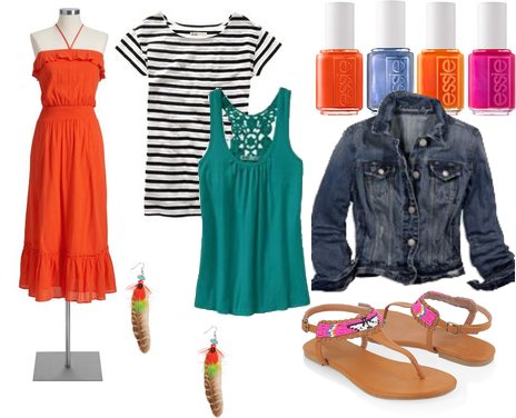 (above: dress, striped top, crochet tank top, nail polish set, denim jacket, sandals, feather earrings)