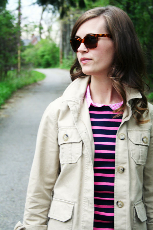 Some where along the lines, Jennifer of Style Your Life and I realized we both own this same striped shirt. So we are both wearing ours on our respective blogs today! This fun combo of navy and bright pink is the perfect spring summer top - the only problem is that it has been COLD here lately... highs in only the 50s everyday make for very cold (albeit sunny) mornings. So layers are key.