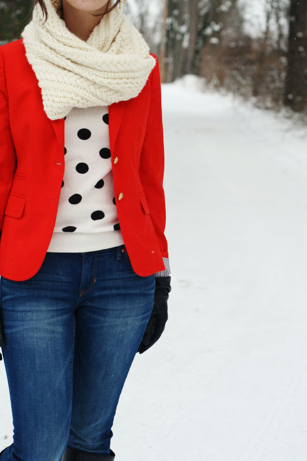 I've never been a huge red person (except for red jeans, I'm all over those)... but lately I am really drawn to it. It seems to be season-less... (spring, check. summer, check. fall, check. winter, check) and a really classic color. Plus, it seems to work as a great neutral. It kind of goes with anything. Neutrals and season-less pieces are definitely my go-to lately. So red is a natural win for me. I sure had a lot of fun wearing this bold blazer.