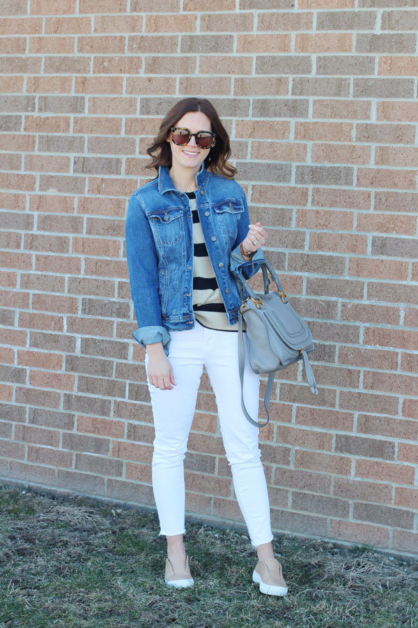 I'm having a pretty intense obsession with denim jackets this season. I want to wear them ALL the time and really, why not?! This one has a boxier cut with a little distressing and the fabric is SO soft and nice and thick. If you want a more fitted version I recommend this one. I just love how classic and easy they are to throw on over a sweater or tee this time of year. You are going to be seeing a lot of them this season - fair warning. This striped sweater is a fun alternative to the classic navy or black stripes with white - it would be great with black pants for an office as well or I plan to wear it with blue jeans and a white blazer this spring as well... which is a fun play on the exact colors shown here. And lastly I have to give a mention about these amazing sneakers... I snagged them in black last fall and was surprised how much they were worn and how amazingly comfortable they were. SO when I saw them in this camel/nude leather for spring I was pretty excited. These cuties are going to get A LOT of wear this spring... they are perfect for hanging with the kids, running errands and weekends on the go.