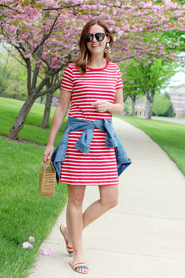 I recently snagged these rainbow sandals and I am officially obsessed with them. They are cute, comfortable and quite flattering as well. And let's be honest here, they are just more stripes in disguise. AmIright!?! I love how you can pretty much pair them with anything. They are over the top fun to wear with this bold red striped dress... but I equally love them with jean and a chambray top, shorts and tees or even to pair with a blazer and jeans for a summer night out.