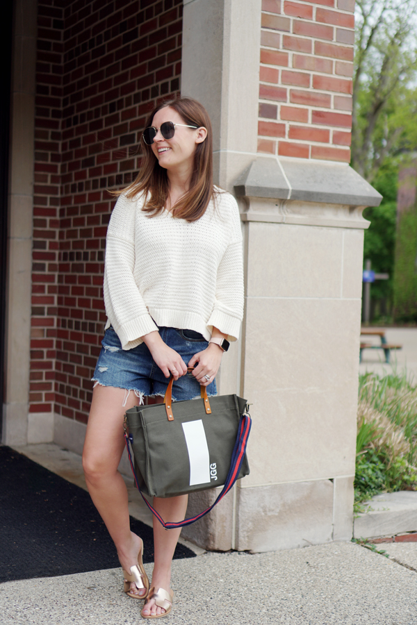 Just in time for Memorial Day weekend I've got three easy weekend looks for you. Simple t-shirts, white jeans, cut off shorts and all the hopes of sunshine are what I am bringing into the long Memorial Day weekend. I couldn't resist snagging this "long weekend" tee that I will for sure be wearing all summer - I mean who doesn't love a long weekend the summer? It pairs perfectly with white jeans and sneakers for hanging out with the family all weekend. If shorts are more your style I love this pair with an oversize spring sweater. This sweater is the perfect lightweight spring piece for those chilly mornings. And jeans and a stripe tee are always a win in my book!