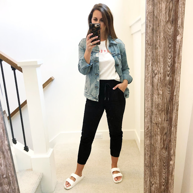 My favorite way to wear joggers is this look! A graphic tee, a denim jacket and birks. I could wear this look everyday - would that be bad? (shop the pieces: tee, denim jacket, joggers - or see more options below, Birkenstocks)